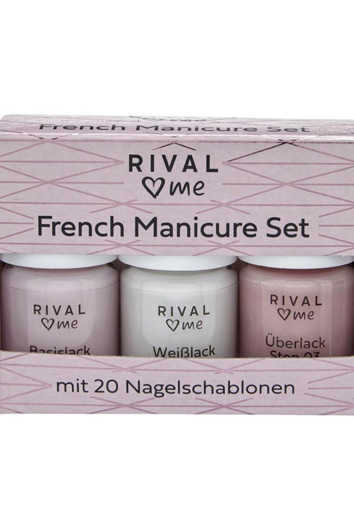 | Fransız manikür seti bakımlı Fransız manikür görünümü için her şeyi içeriyor: Taban kat, beyaz lake, üst kat ve 20 tırnak şablonu. Uygulama: Taban katını tüm tırnağa uygulayın ve kurumasını bekleyin. Şablonu tırnağa yapıştırın, böylece tırnağın ucu serbest kalır. Sadece beyaz verniği tırnağın ucuna uygulayın ve kurumasını bekleyin. Şablonu çıkarın. Tüm tırnağı bitirmek için üst kat kullanın. |