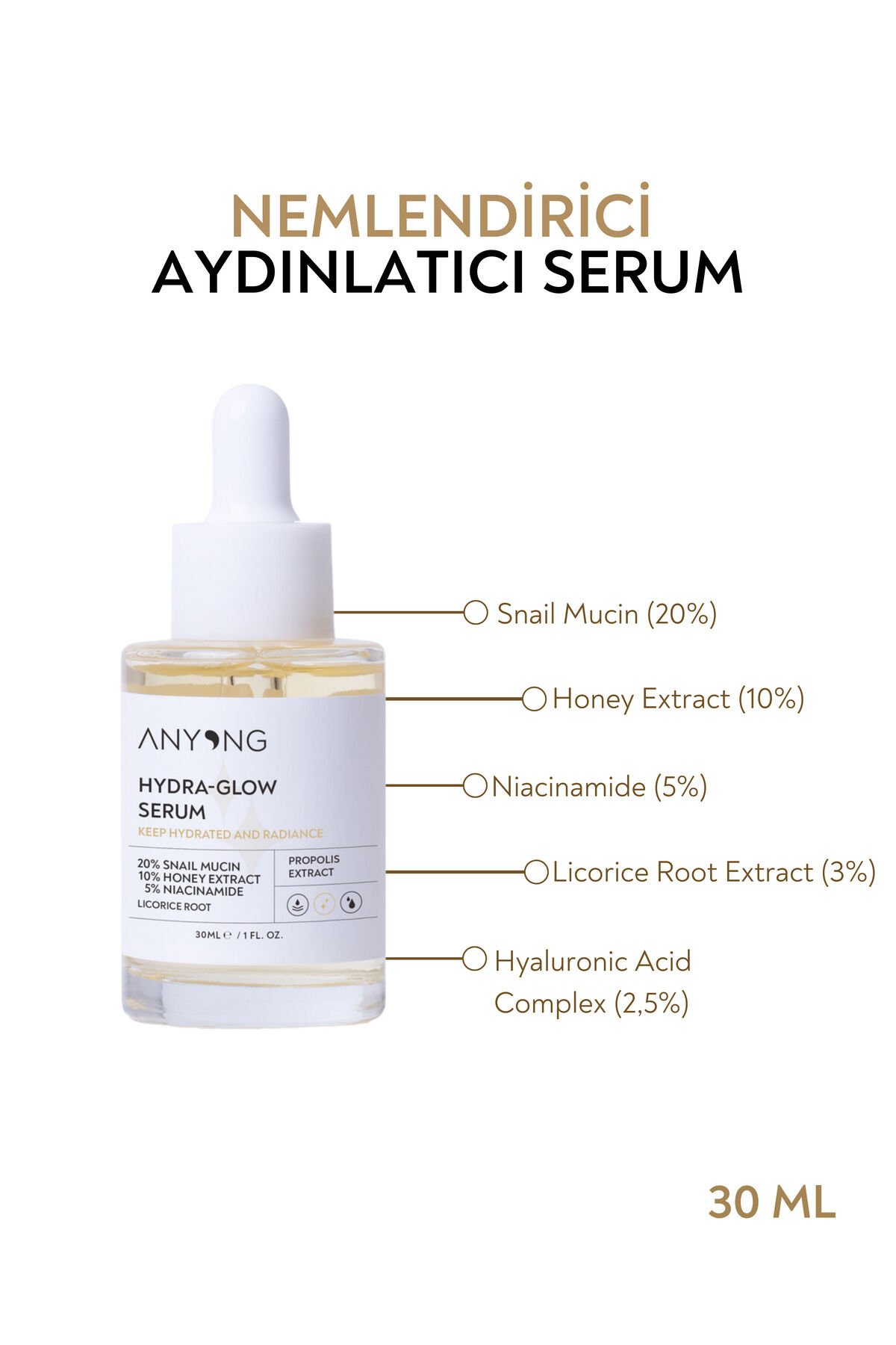 Nemlendirici, Aydınlatıcı, Yatıştırıcı, Canlandırıcı Serum 30 ml (SALYANGOZ ÖZÜ & BAL & NİASİNAMİD)