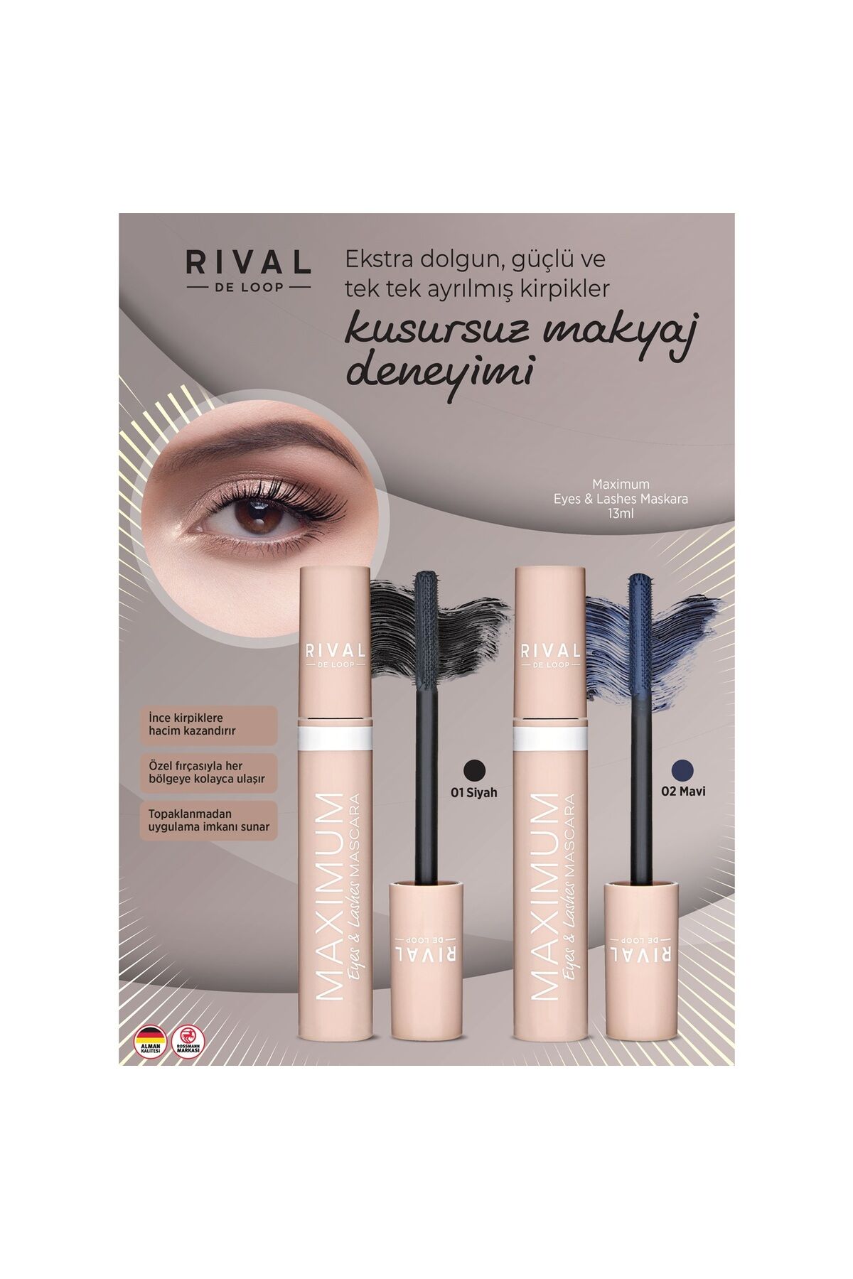• Rival de Loop maskara maximum eyes & lashes, güçlü kirpiklere kavuşmanızı sağlayarak daha derin bakışlar ve kusursuz bir makyaj deneyimi sunar.
